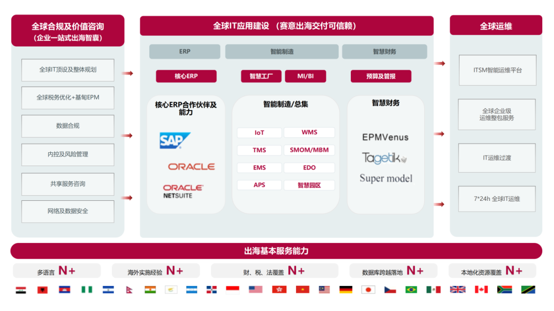 Comprehensive service and product systemTo provide global legal compliance consulting services and digital transformation solutions for enterprises, actively explore AI empowered innovative technologies, and provide 7 * 24-hour global IT operation and maintenance services, providing solid guarantees for the expansion and sustainable development of enterprises in overseas markets.